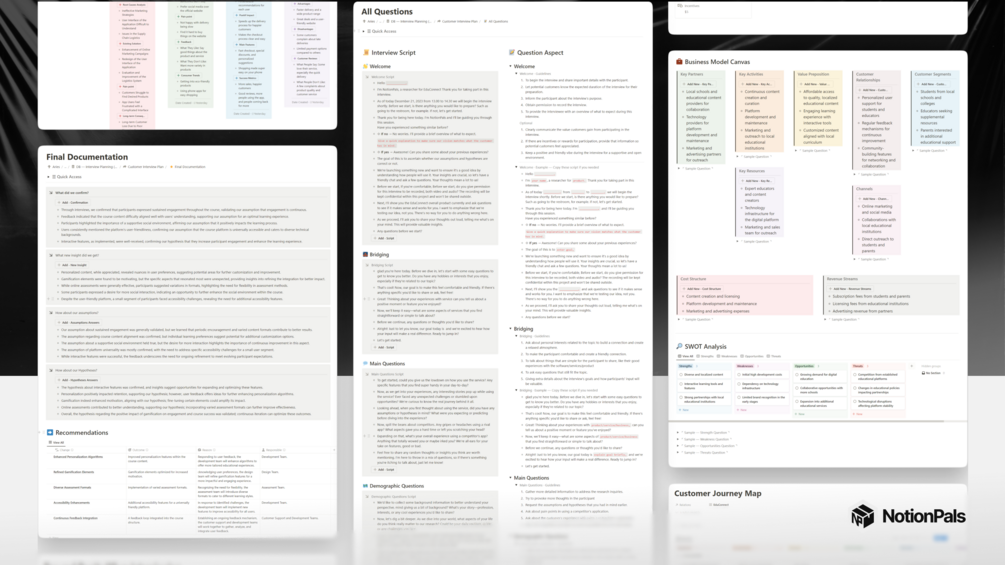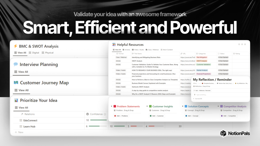 With 'Notion feat. Early Success Business Plan,' you can figure out which business ideas have the best chance of success. It uses different tools like BMC, SWOT, Interviews, Customer Journey Map, Prioritize Your Idea, learning from the best articles, and special sticky notes for planning ideas, such as Problem Statements, Customer Insights, Solution Concepts, Competitor Analysis.